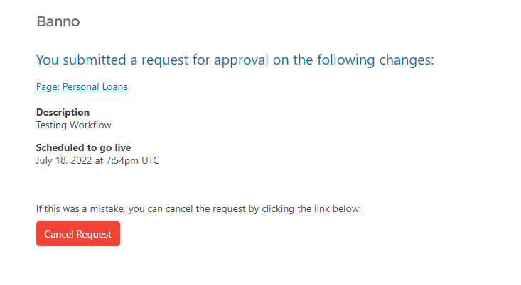 • A confirmation email is sent to the submitter to show what pages they requested approval on and also gives them the chance to cancel the request for approval if needed.