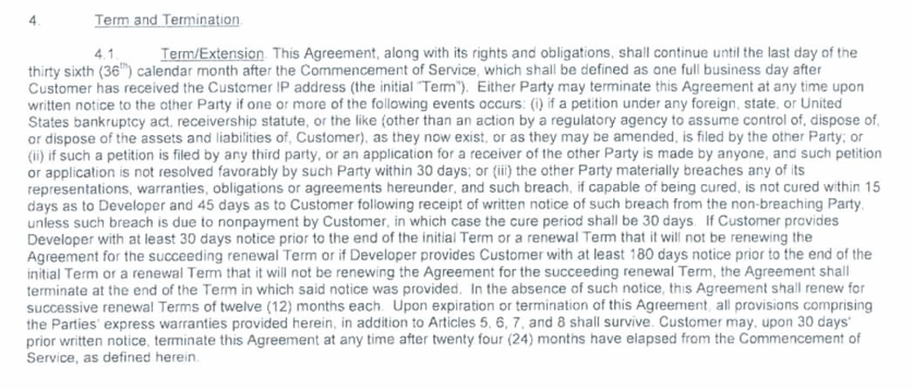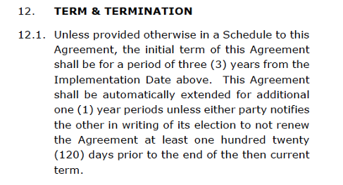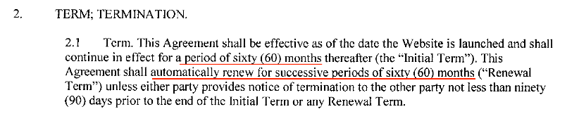 - Their initial term agreement was for 5 years and will automatically renew for an additional 5 years unless they send a notice of termination 90 days prior to end of term.