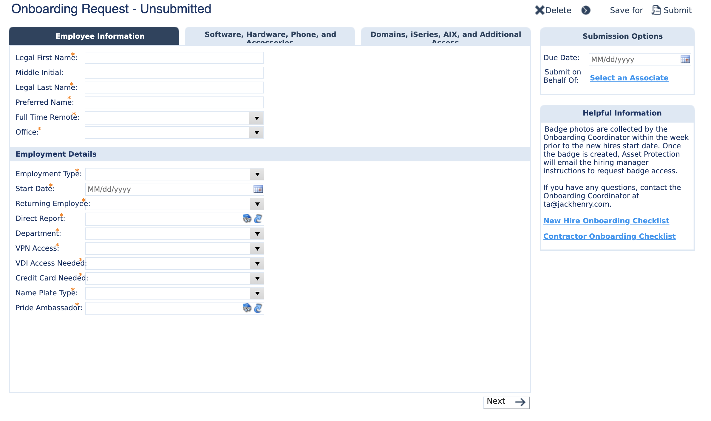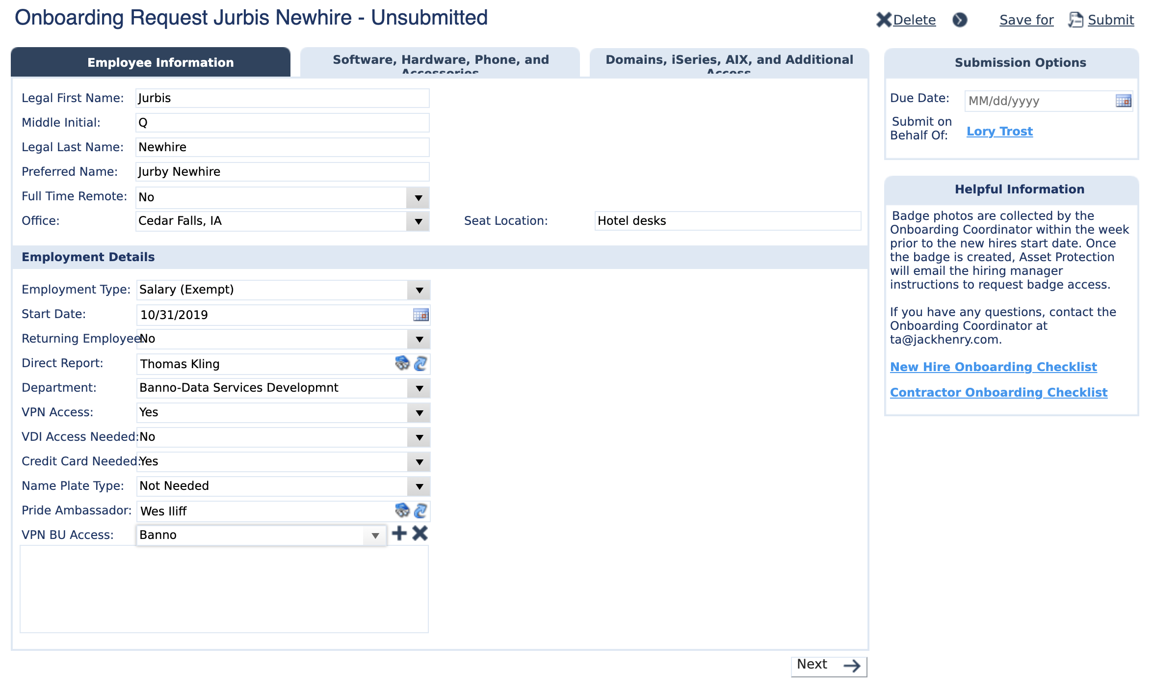 New associates will need VPN but not VDI. Credit Card will be needed by any salaried employees, as it is used to cover travel, conferences, etc. Name Plate Type should be Not Needed, unless you’re feeling spicy and want to get them a little treat.