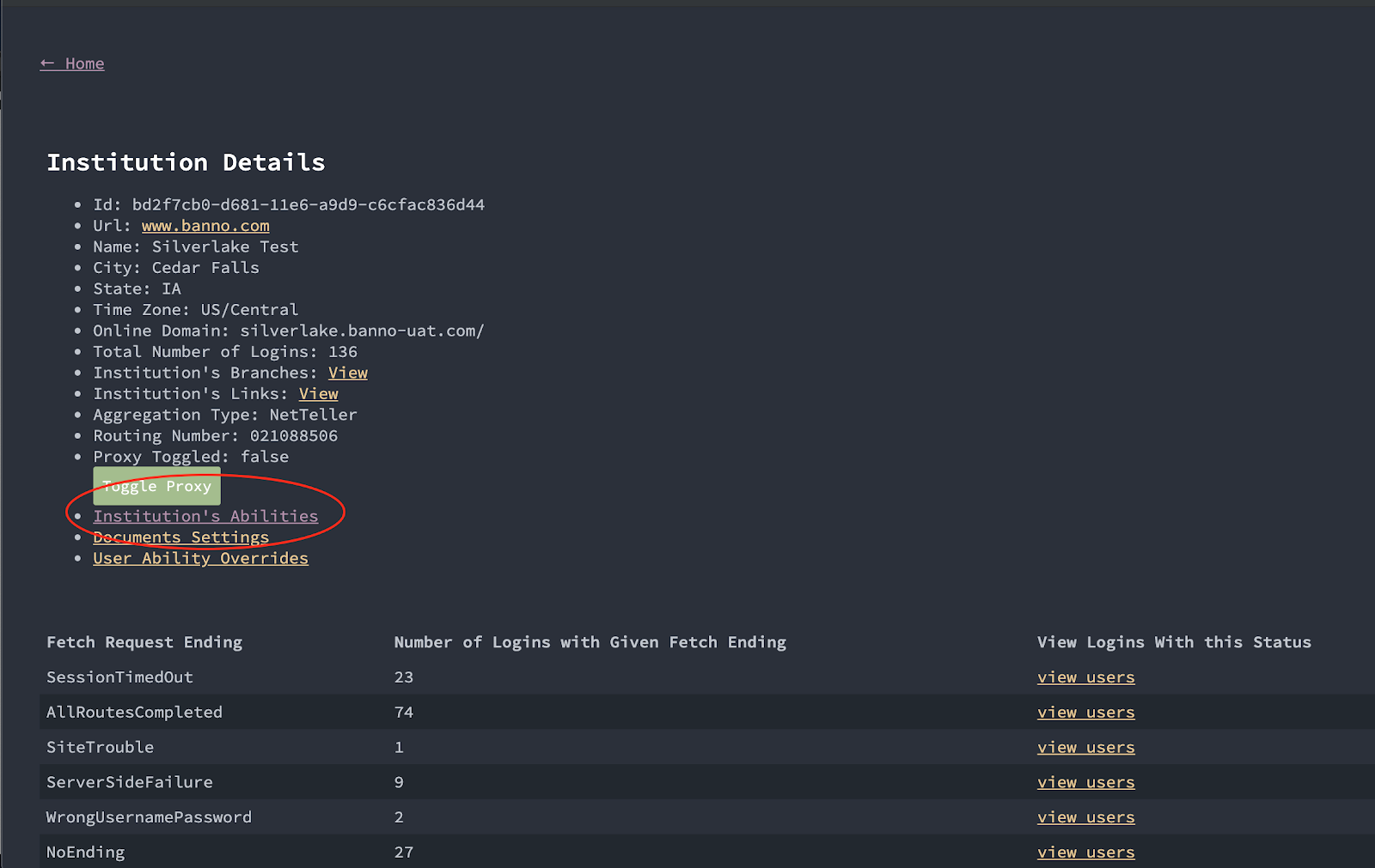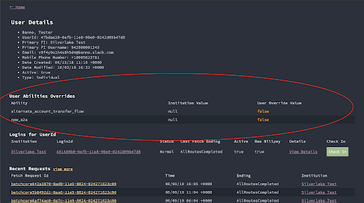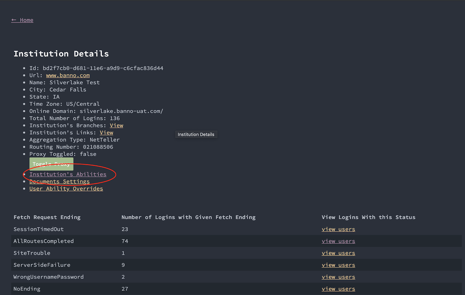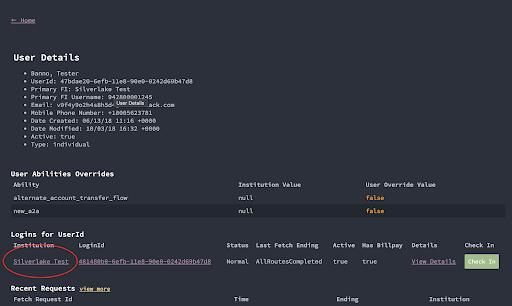 2. From the User Details view, if you need to see the abilities set at the institution level (or any other FI-level info), click the link for the institution’s name.