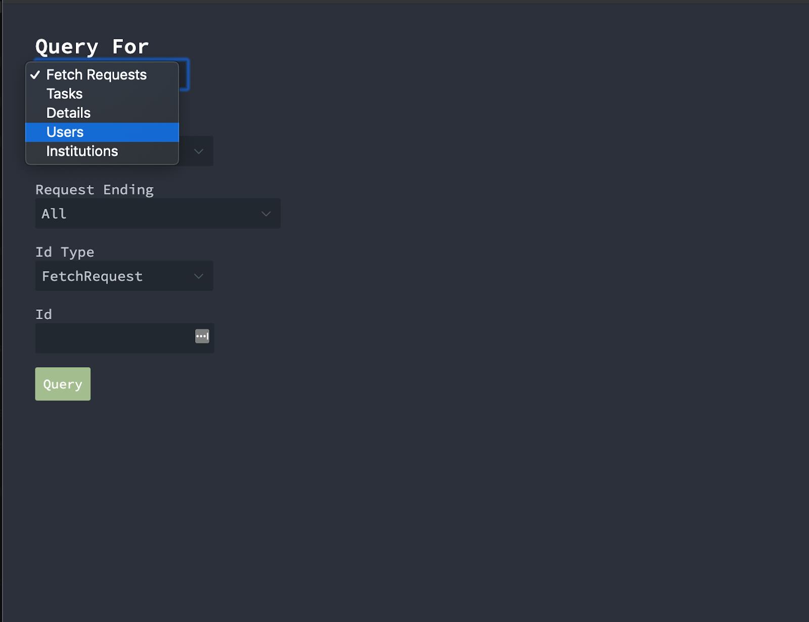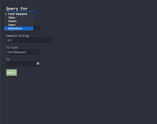 1. Under the Query For dropdown, select Institutions.