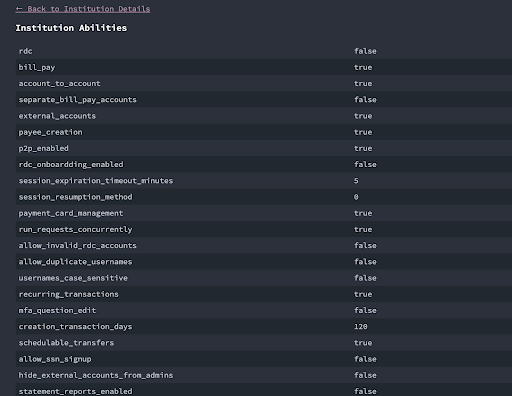 • Institution Details shows you other useful info, such as the FI’s Routing Number and Time Zone.