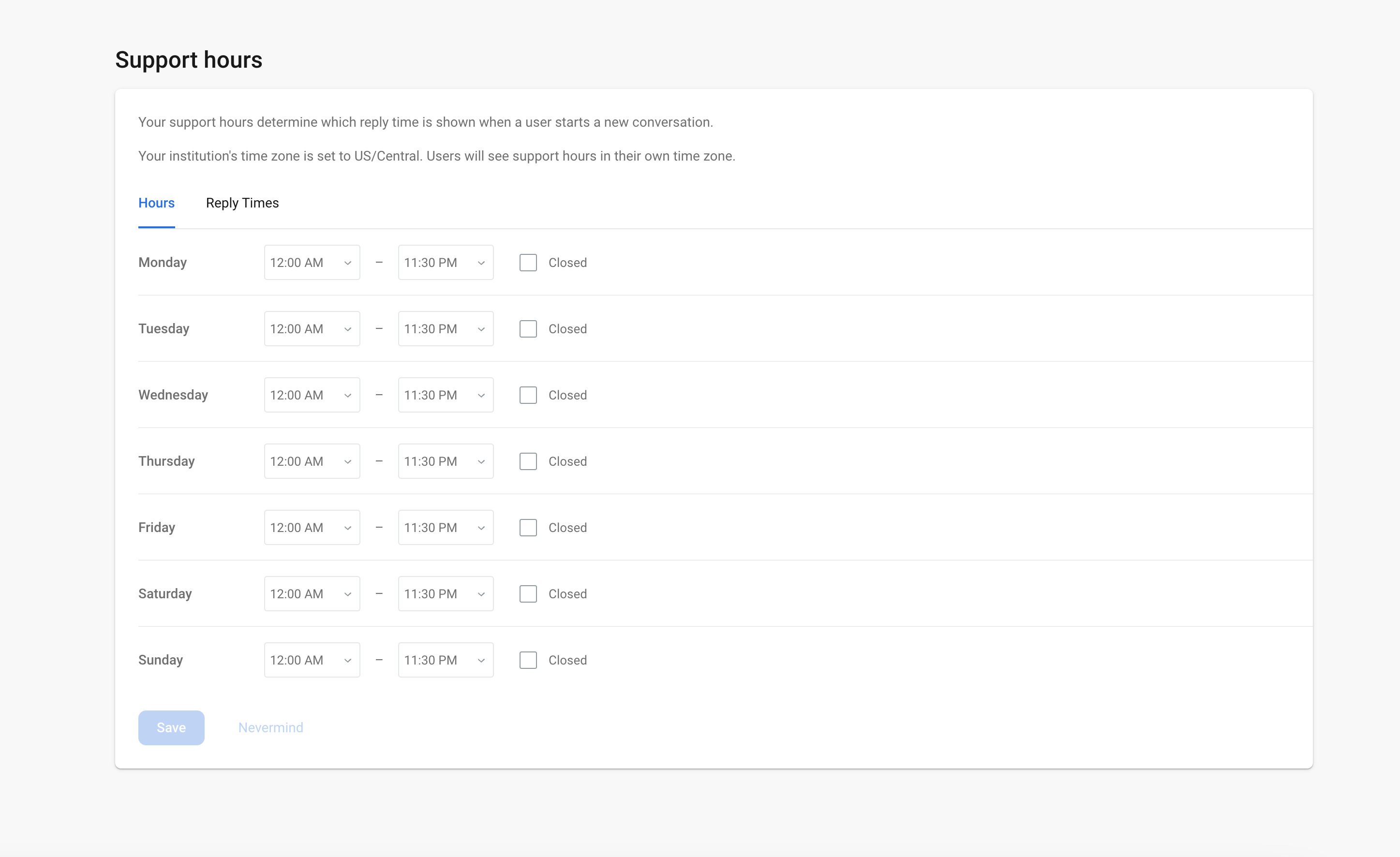 - Changing the times of the support hours should directly affect when an auto reply gets sent to the consumer